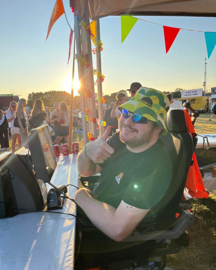 Selvom alle er Maks pressede, så møder man altid hinanden med store smil og krammere, fordi man er så glad for at se hinanden igen. Jeg bliver nødt til at dele en lille oplevelse med jer, da den virkelig gjorde indtryk. Mens jeg stod i bar, kom der en kunde op og nærmest fik tåre i øjnene da hun så mig sidde der. Hun spurgte hvad jeg lavede udover at sidde her og jeg fortalte at jeg læser HF og at jeg samtidig arbejder for kræwet i min sommerferie. Hun blev ekstra berørt, da hun kun har kendt handicappede som ikke var så selvstændige og selvkørende som mig. Vores møde ved baren bekræftede mig bare i at selvom jeg har nogle småproblemer i hverdagen, så hører jeg til hos kræwet og kan bidrage på lige fod med andre. Jeg er så glad for at kunne hjælpe med at samle penge ind til Muskelsvindsfonden og på den måde hjælpe andre der har det lige som mig selv. Så tusind, tusind tak til jer der køber billet, køber drikkelse og mad på vores Grøn koncerter rundt i landet. Det er vi mange omkring karavanen der sætter stor pris på, da pengene går til et godt formål. Et lille smil, en highfive og en skål betyder mere end I tror!”